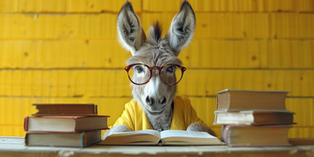 A studious donkey wearing glasses, reading a book in a cozy library, creating a humorous and whimsical atmosphere.