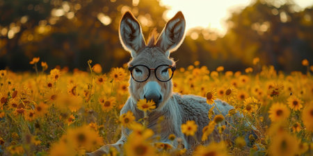 A cute donkey wearing glasses, lounging in a field of yellow flowers during a sunny day, creating a humorous scene.