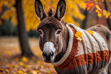 AI Generative Donkey in knitted sweater on autumn forest background, animal in red and yellow foliage