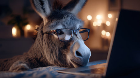 A donkey wearing glasses sits in a relaxed position, leaning towards a laptop. The cozy room is softly illuminated by candles, creating a warm and inviting atmosphere.