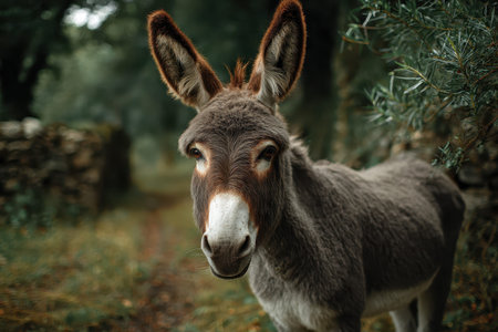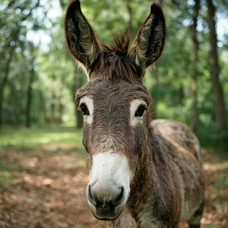 Close-up portrait of a curious donkey in a forest