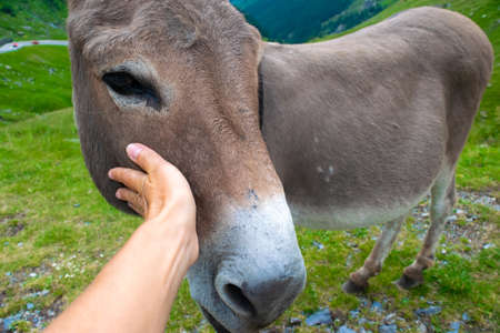 Hand of a man touches the donkey to stroke it. Donkeys graze and beg tourists for food near a mountain Transfagarasan highway, is one of the most beautiful roads in the world. Romania.