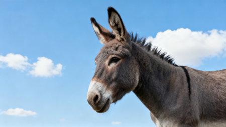 Close up of donkey's face with blue sky in the background. Generative AI.