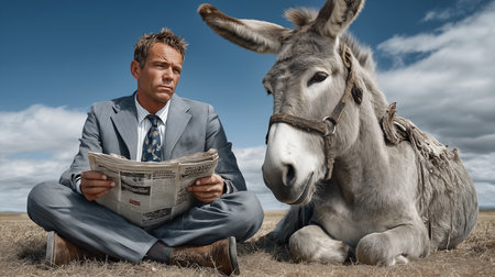 Businessman sitting on the field with a donkey and reading a newspaper