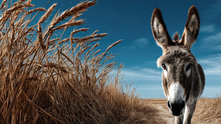A curious donkey stands in a golden grass field, gazing directly at the viewer against a backdrop of a vibrant blue sky, creating a serene rural scene.