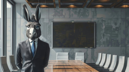 A surreal and humorous image showing a businessman in a suit with donkey ears standing in an empty, modern boardroom, creating a striking and whimsical contrast between professionalism and humor.
