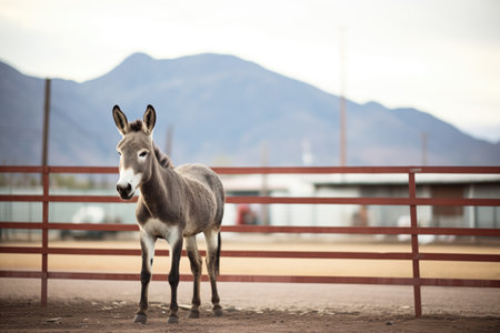 Livestock. A donkey in a pen. The concept of animal husbandry and rural life. A pet on a private eco-farm. Agricultural industry.