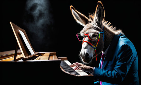 A donkey in a blue suit performs at the piano, highlighted by a spotlight. The image captures a blend of music and comedy in a dramatic setting.