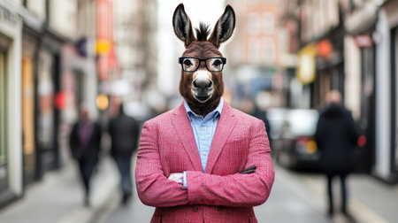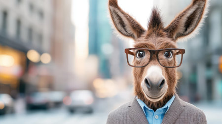 Comically dressed donkey in glasses takes on urban life, showcasing a witty take on business culture and society norms.