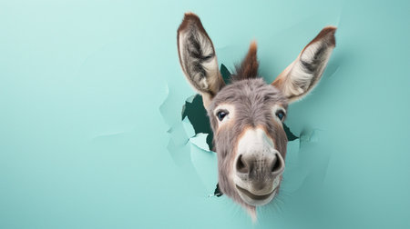 donkey looking up in pastel color paper side torn hole isolated