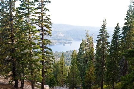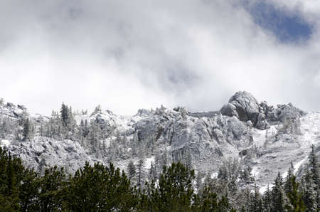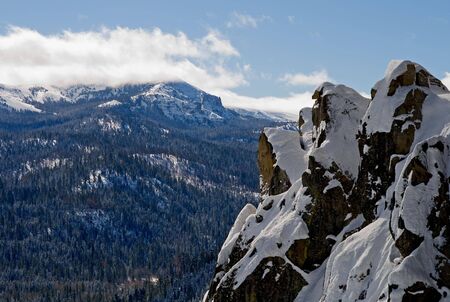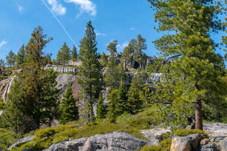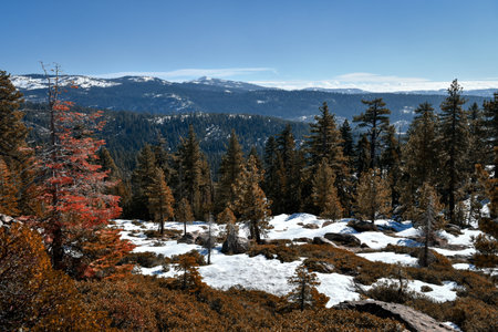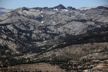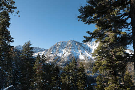 Mountain with a snow and pine trees, views near Lake Tahoe in the spring