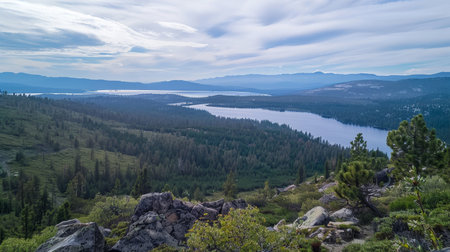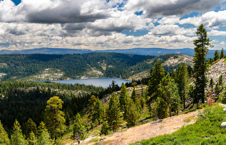 Scenic view of Bear River Reservoir from Peddler Hill Overlook in the Sierra Nevada mountains, California. Pine forests cover the hills under a dramatic cloudy sky. Represents nature and wilderness