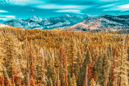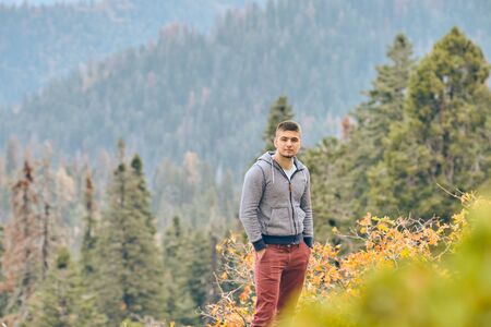 Tourist man hiking in Sequoia National Park at fall, looking at autumn mountain scenic landscape. California, United States.