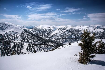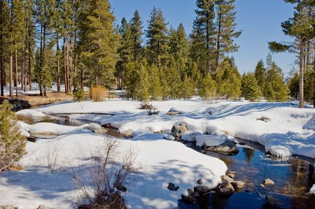 Snow-covered forest air of the mountains, snow, sea and stream coast