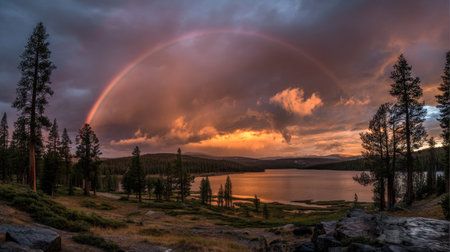 Captivating view of a rainbow arching over a serene lake at sunset, surrounded by lush pine trees and dramatic clouds, showcasing the beauty of nature's wonders.