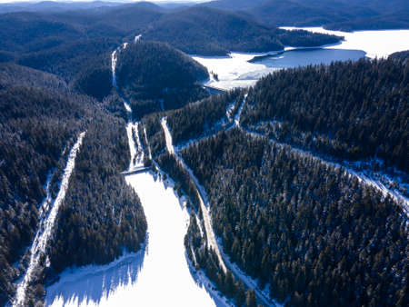 Aerial winter view of Beglika Reservoir covered with ice, Pazardzhik Region, Bulgaria