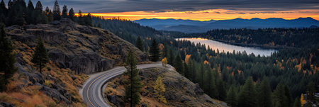 A winding road curves through a landscape of dense trees, overlooking a peaceful lake at sunset, with vibrant colors lighting up the sky and mountains in the distance.