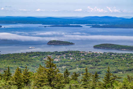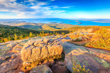 Beautiful view to Bar Harbor and nearby islands from Cadillac Mountain in Acadia National Park