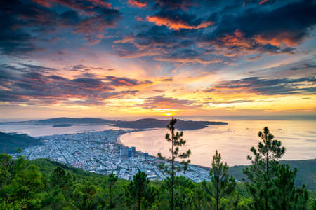 Aerial view of the city of Quy Nhon, Vietnam. Big sandy beach and beautiful mountains in the background