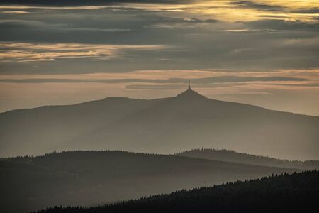 Evening view to Praded and few other hills from Cervena hora hill in Jeseniky mountains in Czech republic