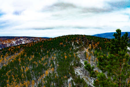 Mountain in the autumn forest with trees with a stone rock at the top. Mountain forest on a background of blue sky. Winter nature in the forest.