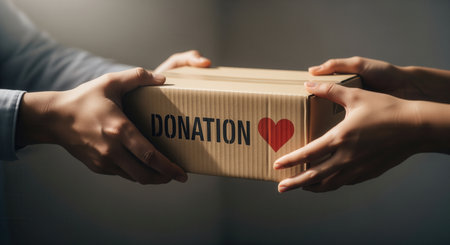 Two hands exchanging a cardboard box labeled DONATION with a red heart symbol, illustrating concepts of charity, giving, and humanitarian aid.