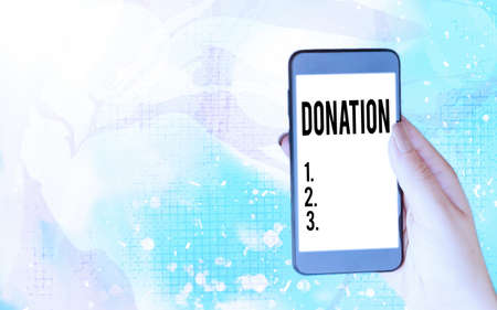 Word writing text Donation. Business photo showcasing the act or an instance of donating such as the making of a gift Modern gadgets with white display screen under colorful bokeh background