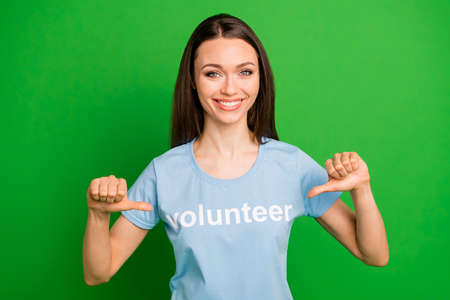 Close-up portrait of attractive lovely charming pretty cute cheerful girl volunteer earth global change charity organization isolated over grey pastel color background