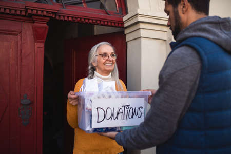 Young volunteer giving donation box to senior woman standing in doorway, social and charity concept