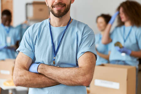 Cropped shot of caucasian male volunteer in blue uniform and protective gloves standing with arms crossed. Team sorting, packing items in cardboard boxes