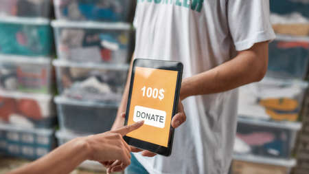 Close up of hand making donation by touching screen of tablet pc, Volunteers advertising or recommending app while working for charity