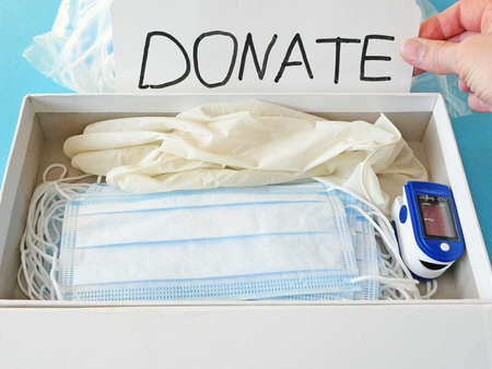 medical face masks, high level protection respirator, medical gloves, pulse oximeter for finger tip simultaneous monitoring of blood flow and transcutaneous oxygen as donating in box,