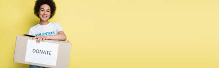 happy african american volunteer showing empty name tag at camera isolated on yellow, banner