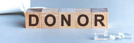 Word Donor. Donor text on wooden blocks. In front of a row of cubes are ampoules, in the background - white plastic packaging from tablets, the cubes are located on a gray surface. Concept Image.