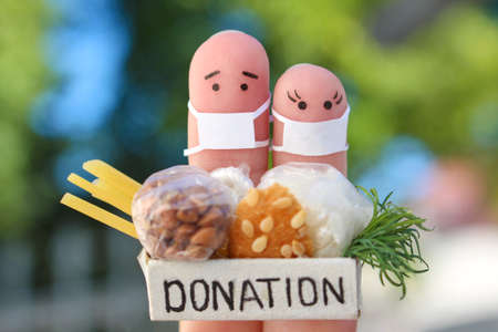 Fingers art of couple with face mask. Man and woman holding donation box with food.