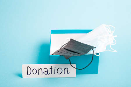 blue cardboard box with medical protective disposable masks in different colors, donation plate, blue background, copy space, donations box concept