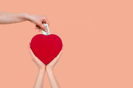 Charity background, blood or organ donation in exchange for money, concept photo with red heart