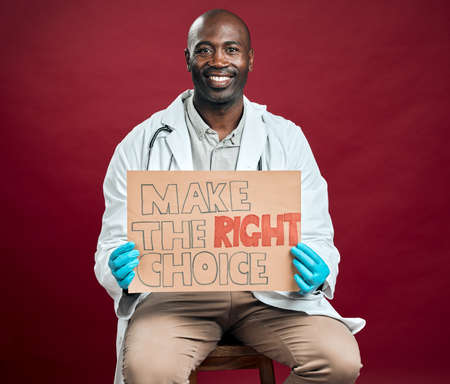African american covid doctor holding and showing poster. Portrait of smiling black physician isolated on red studio background with copyspace. Man promoting and encouraging corona vaccine on sign