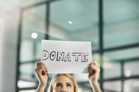 A woman asking for a donation, charity and help while holding a sign in need of support in a corporate office. Volunteer asking for assistance and crowdfunding from the community and businesses