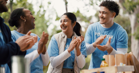 Applause, food drive and volunteer people outdoor for celebration, donation success or motivation. Charity, milestone and support with excited friends clapping in park together for community outreach