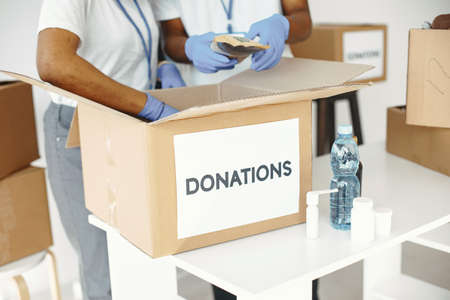 Cropped shot of volunteers in blue uniform, protective masks and gloves sorting, packing food and water in cardboard boxes, working together on donation project