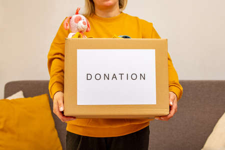 Female volunteer holding donation box with old used toys and clothes indoors. Happy Charity. Unrecognizable woman holding box with clothes in it. close-up. Clothing donation. Winter clothes in a cardboard box. Seasonal clothing