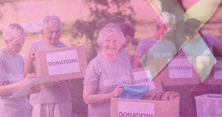 Multiple image of caucasian seniors holding donation boxes and awareness ribbon. International day of charity, together, retirement, healthcare, volunteer, support, healthcare, celebration concept.