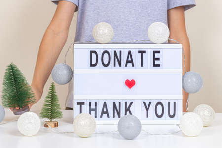 Christmas donation, charity. White lightbox with message Donate and Thank you standing on the table. Front view, close up