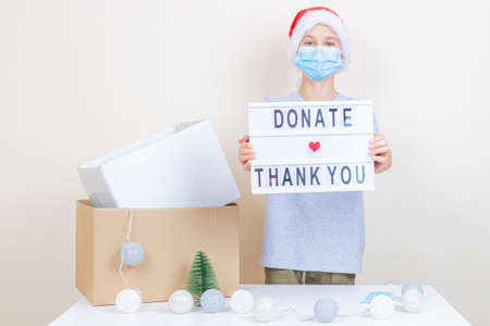 Christmas donation, charity. Kid volunteer with Santa hat and medical protective face mask holding lightbox with message Donate and Thank you. Boy standing near table with empty cardboxes for donation