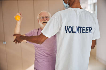 Young African American volunteer fitness instructor in a disposable face mask training a senior man