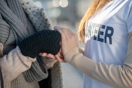 Volunteer shaking hands. Close up of volunteer shaking hands of poor homeless pensioner while supporting her