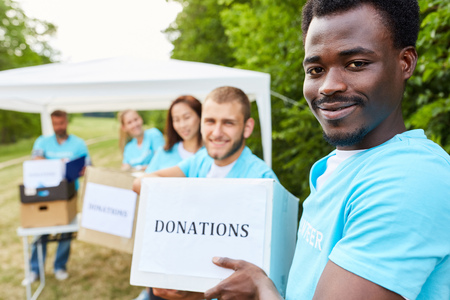 Group of volunteers inviting new members and collecting clothes, food and household items in donation center