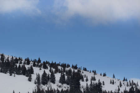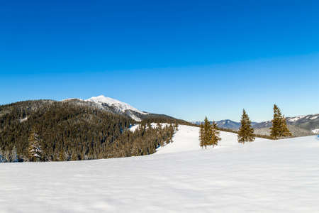 Nature scenery. Glade in the forest on a mountain range. Sunny winter day.
