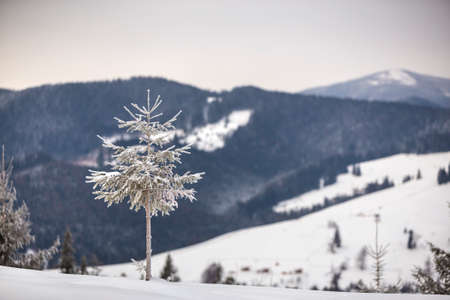 Winter landscape. Tall pine tree alone on mountain snowy slope on cold sunny day on blurred background of dense spruce forest.
